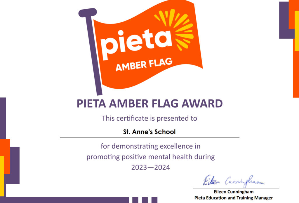 We are thrilled to announce that St. Anne’s School was awarded the 2023/2024 Pieta Amber Flag, recognising our commitment to promoting positive mental health and wellbeing throughout our school community.